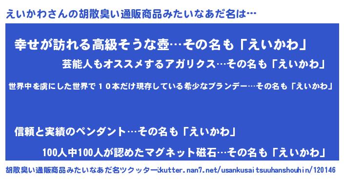 | 意味不明あだ名 | 『住所不定無職えいかわ(86歳)』 |