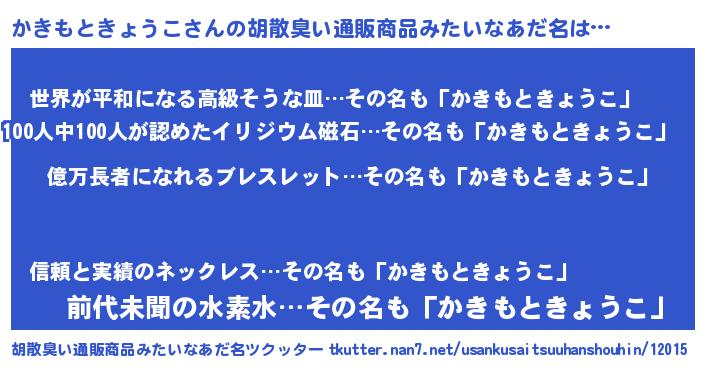 | 男性向けラノベタイトル風あだ名 | 『かきもときょうこ~年齢イコール彼女いない歴の魔法使い~』 |