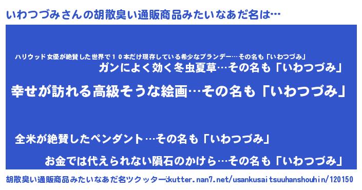 | 女子向けラノベタイトル風あだ名 | 『いわつづみの雑貨屋さん』 |