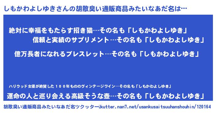 | ヘコむあだ名 | 『しもふぇ~』『しもかわよしゆき(笑)』 |