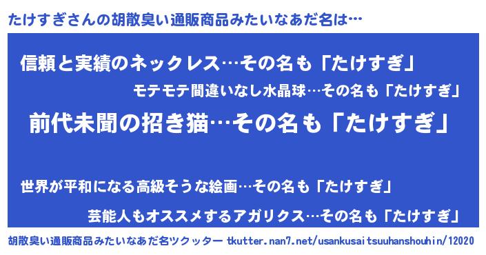 | 意味不明あだ名 | 『永久保存たけすぎ』『自称たけすぎ』 |