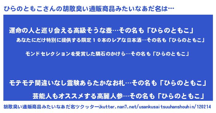 | 女子向けラノベタイトル風あだ名 | 『ひらのともこの玉の輿計画!』 |