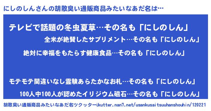 | 男性向けラノベタイトル風あだ名 | 『にしのしんという概念が存在しない退屈な世界 』 |