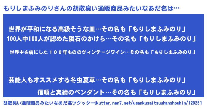 | 男性向けラノベタイトル風あだ名 | 『この素晴らしい世界にもりしまふみのりを!』 |