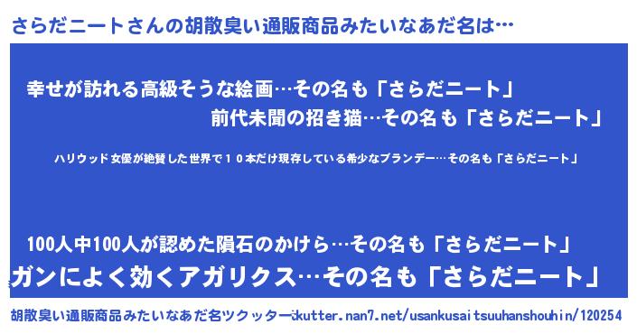 | 意味不明あだ名 | 『住所不定無職さらだニート(98歳)』 |