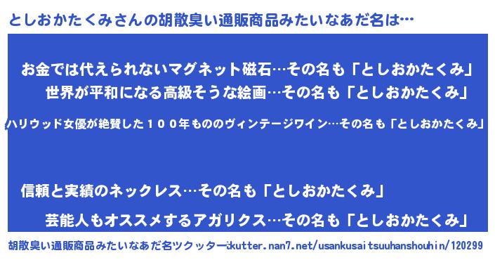 | 意味不明あだ名 | 『住所不定無職としおかたくみ(3歳)』 |