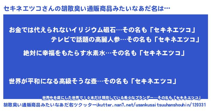 | 男性向けラノベタイトル風あだ名 | 『セキネエツコという概念が存在しない退屈な世界 』 |