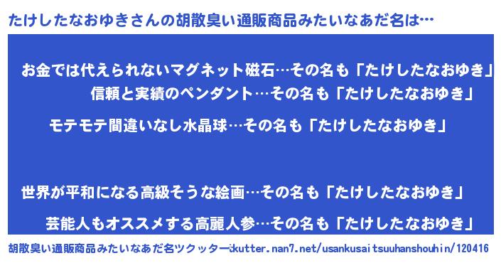 | 男性向けラノベタイトル風あだ名 | 『たけしたなおゆきに滅ぼされるだけの簡単なお仕事です』 |