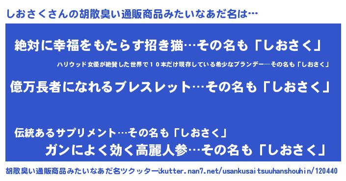 | 男性向けラノベタイトル風あだ名 | 『しおさくに滅ぼされるだけの簡単なお仕事です』 |