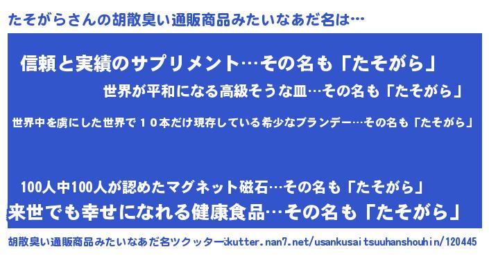 | 意味不明あだ名 | 『住所不定無職たそがら(89歳)』 |