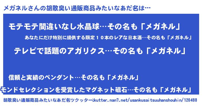 | ヘコむあだ名 | 『メガもー』『メガ太郎』『酢こんぶ』 |