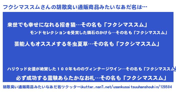 | 欧米人風あだ名 | 『フクシマススム・ステッグマイヤー』 |