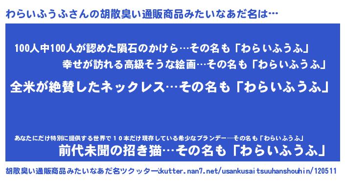 | ヒーロー風カッコイイあだ名 | 『幻影騎士ワラ』『ネオワライフウフ』 |