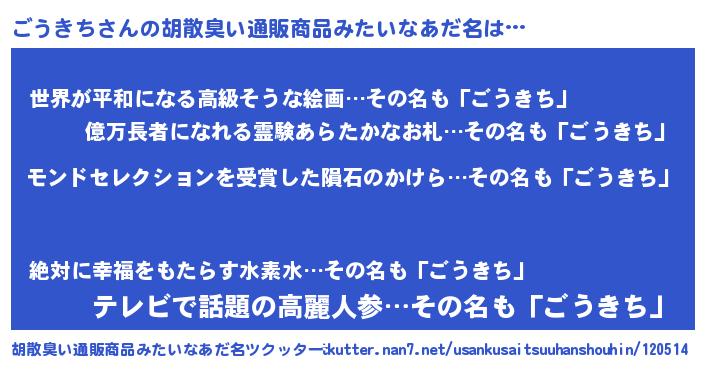 | 意味不明あだ名 | 『つくし科ごうきち属』『自称ごうきち』 |