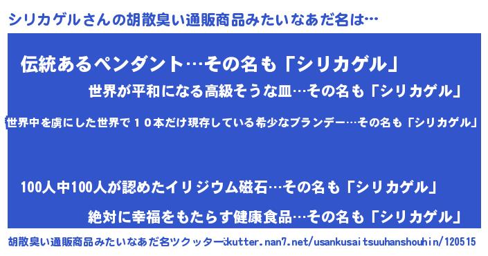 | 男性向けラノベタイトル風あだ名 | 『この素晴らしい世界にシリカゲルを!』 |