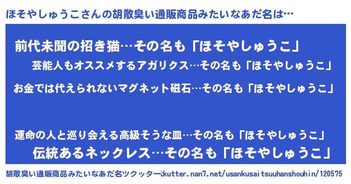 | 男性向けラノベタイトル風あだ名 | 『ノーゲーム・ノーホソヤシュウコ』 |
