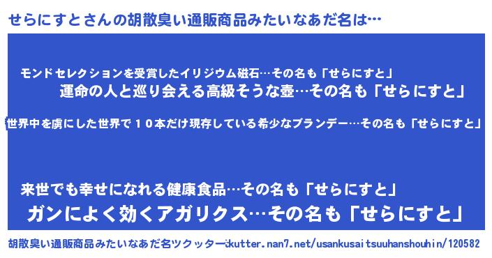 | 男性向けラノベタイトル風あだ名 | 『せらにすとに滅ぼされるだけの簡単なお仕事です』 |