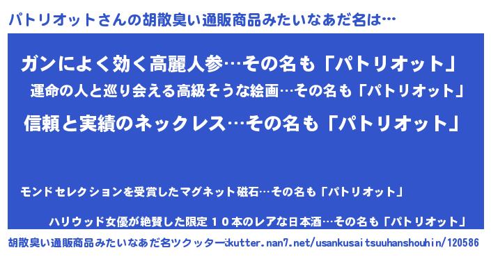 | 男性向けラノベタイトル風あだ名 | 『ダンジョンにパトリオットを求めるのは間違っているだろうか』 |