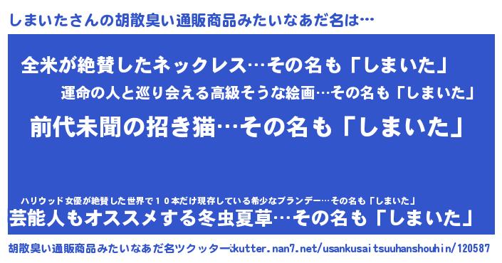 | 意味不明あだ名 | 『永久保存しまいた』『自称しまいた』 |