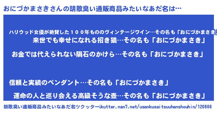 | 男性向けラノベタイトル風あだ名 | 『おまえをオタクにしてやるから、俺をおにづかまさきにしてくれ! 』 |