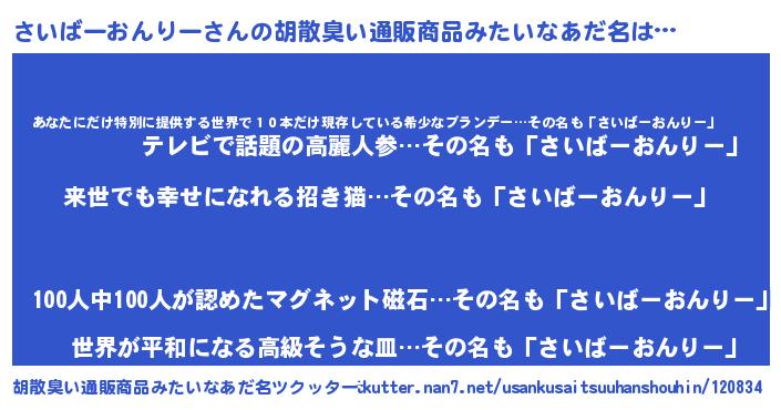 | 男性向けラノベタイトル風あだ名 | 『さいばーおんりーという概念が存在しない退屈な世界 』 |