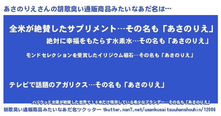 | ヘコむあだ名 | 『あさ太郎』『あさのりえ(笑)』 |