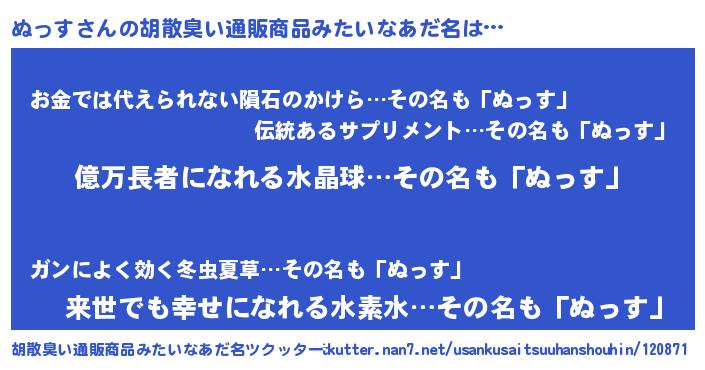 | 意味不明あだ名 | 『ペロリンぬっす』『永久保存ぬっす』 |