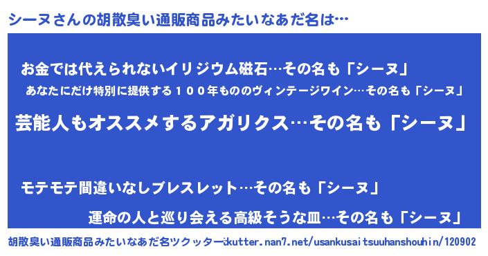 | ヒーロー風カッコイイあだ名 | 『究極戦士シーヌ』『慈愛の使者シーヌ』 |