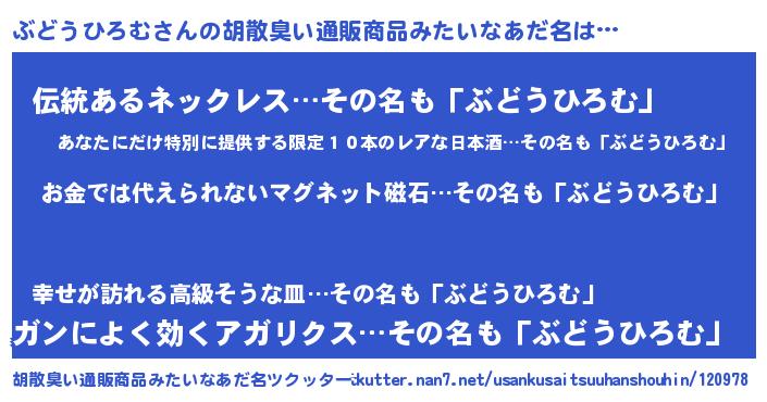 | 男性向けラノベタイトル風あだ名 | 『ノーゲーム・ノーブドウヒロム』 |