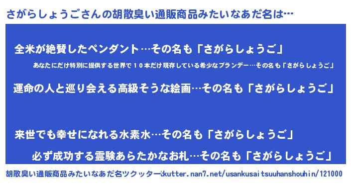 | 肩書あだ名 | 『さがらしょうご総理大臣』 |