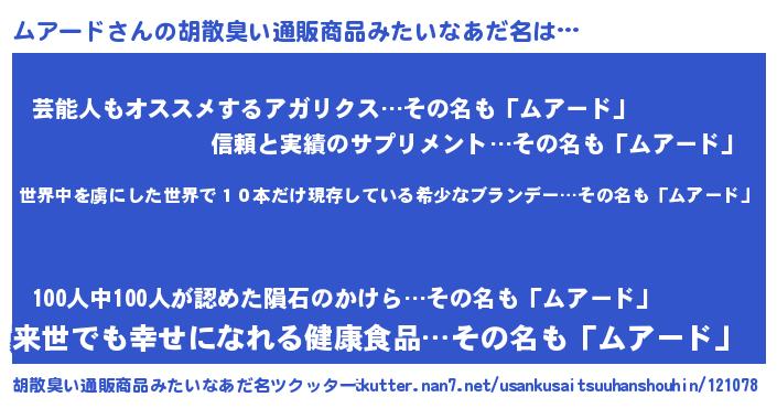 | 意味不明あだ名 | 『住所不定無職ムアード(86歳)』 |