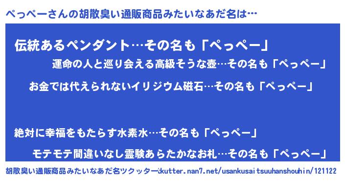 | 男性向けラノベタイトル風あだ名 | 『ノーゲーム・ノーペッペー』 |