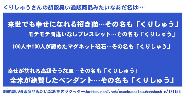 | ヘコむあだ名 | 『くりしゅう(笑)』『くりお』『豆乳』 |