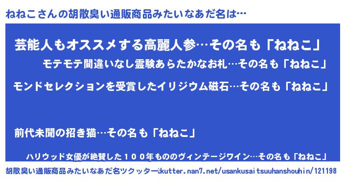 | 男性向けラノベタイトル風あだ名 | 『ねねこに滅ぼされるだけの簡単なお仕事です』 |