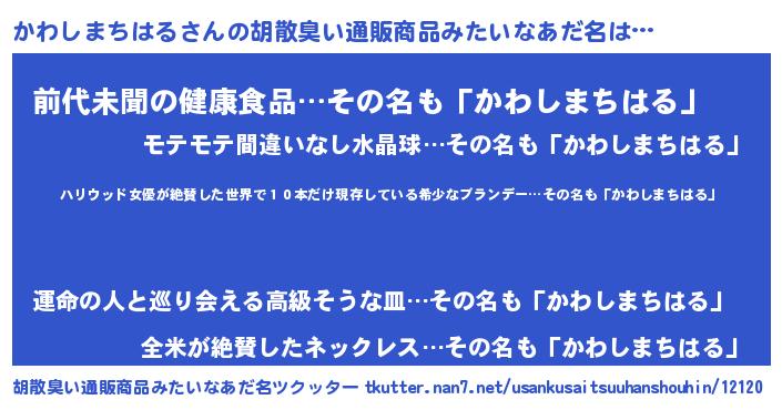 | ヘコむあだ名 | 『かわしまちはる(遠い目)』『かわぷりん』 |