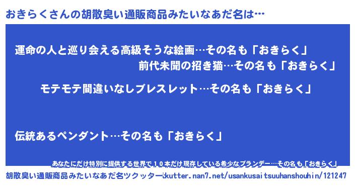 | 男性向けラノベタイトル風あだ名 | 『おきらくの憂鬱』『魔弾の王とおきらく』 |