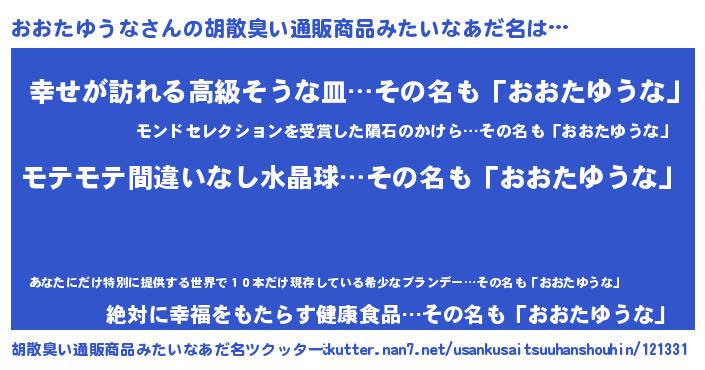 | 男性向けラノベタイトル風あだ名 | 『オオタユウナアートオンライン』 |
