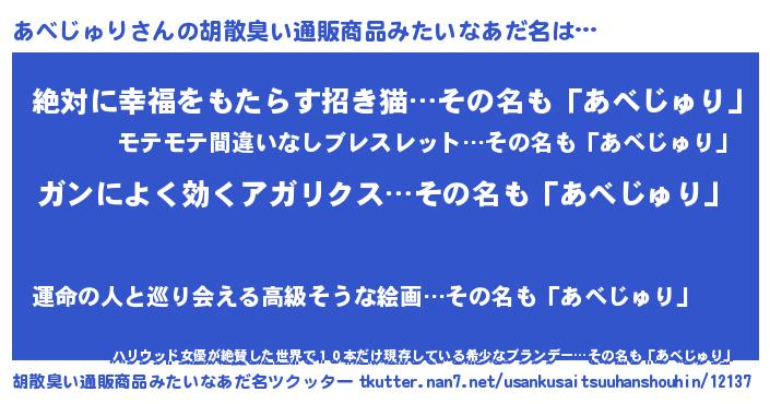 | 意味不明あだ名 | 『自称あべじゅり』『永久保存あべじゅり』 |