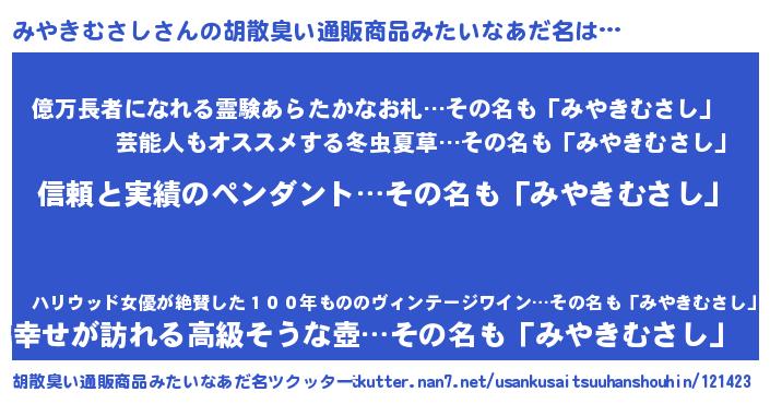 | 欧米人風あだ名 | 『ウサインみやきむさし』 |