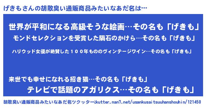 | 意味不明あだ名 | 『住所不定無職げきも(1歳)』『自称げきも』 |