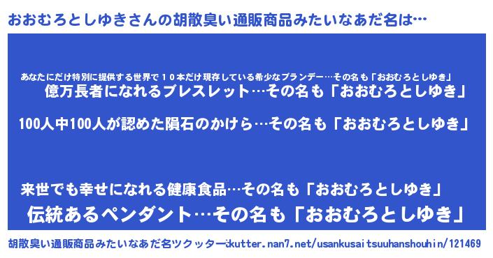 | 男性向けラノベタイトル風あだ名 | 『おまえをオタクにしてやるから、俺をおおむろとしゆきにしてくれ! 』 |