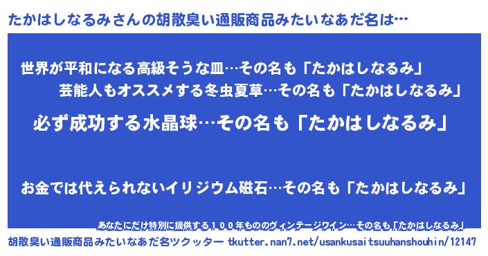 | 恥ずかしいあだ名 | 『プリティーたかはしなるみ』『たかちん』 |