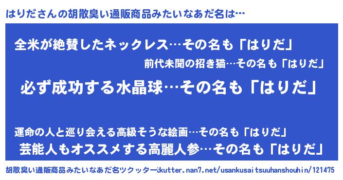 | 男性向けラノベタイトル風あだ名 | 『はりだの憂鬱』『魔法科高校のはりだ』 |