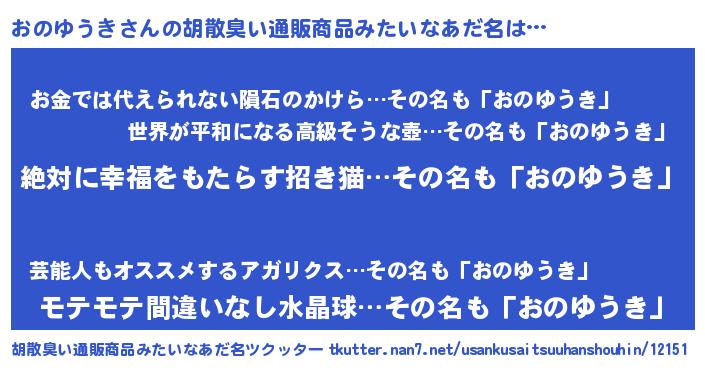 | ヘコむあだ名 | 『おのゆうき(笑)』『おのっふぃ~』 |