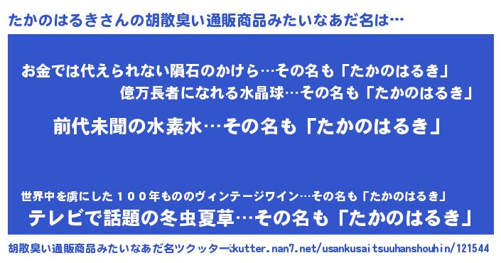 | ヘコむあだ名 | 『たかのはるき(震え声)』『たかっふぃ~』 |