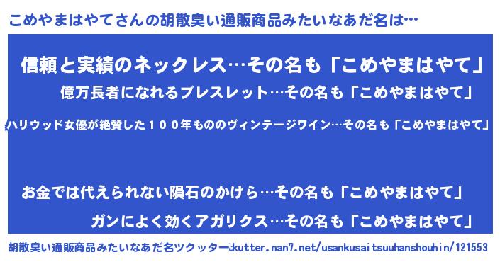 | 男性向けラノベタイトル風あだ名 | 『コメヤマハヤテスレイヤー』 |