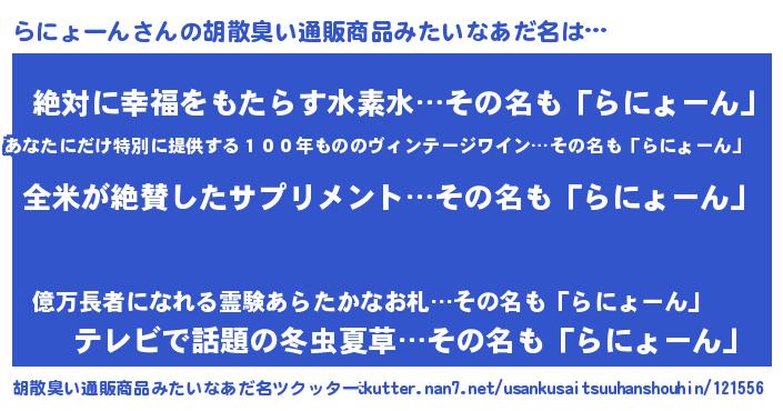 | 男性向けラノベタイトル風あだ名 | 『らにょーんの嫁は女の子じゃないと思った?』 |