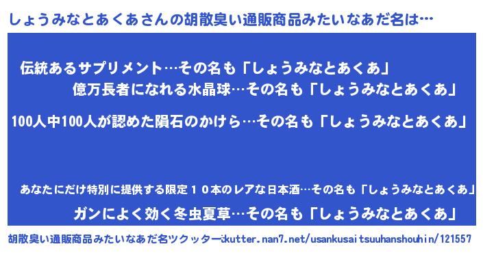 | 男性向けラノベタイトル風あだ名 | 『おまえをオタクにしてやるから、俺をしょうみなとあくあにしてくれ! 』 |