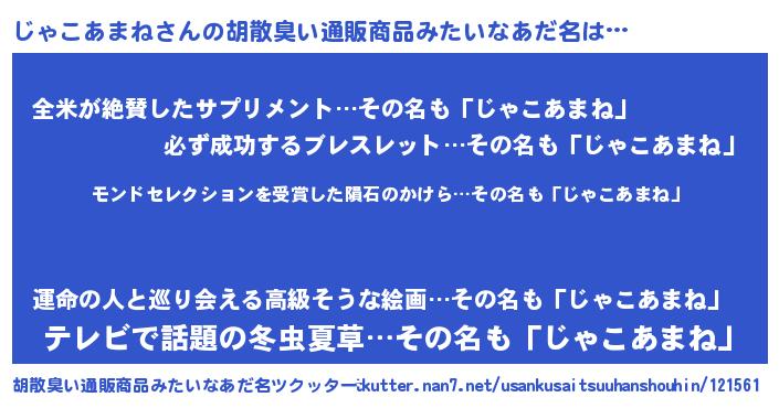 | 男性向けラノベタイトル風あだ名 | 『じゃこあまね~年齢イコール彼女いない歴の魔法使い~』 |