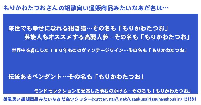 | 意味不明あだ名 | 『住所不定無職もりかわたつお(6歳)』 |